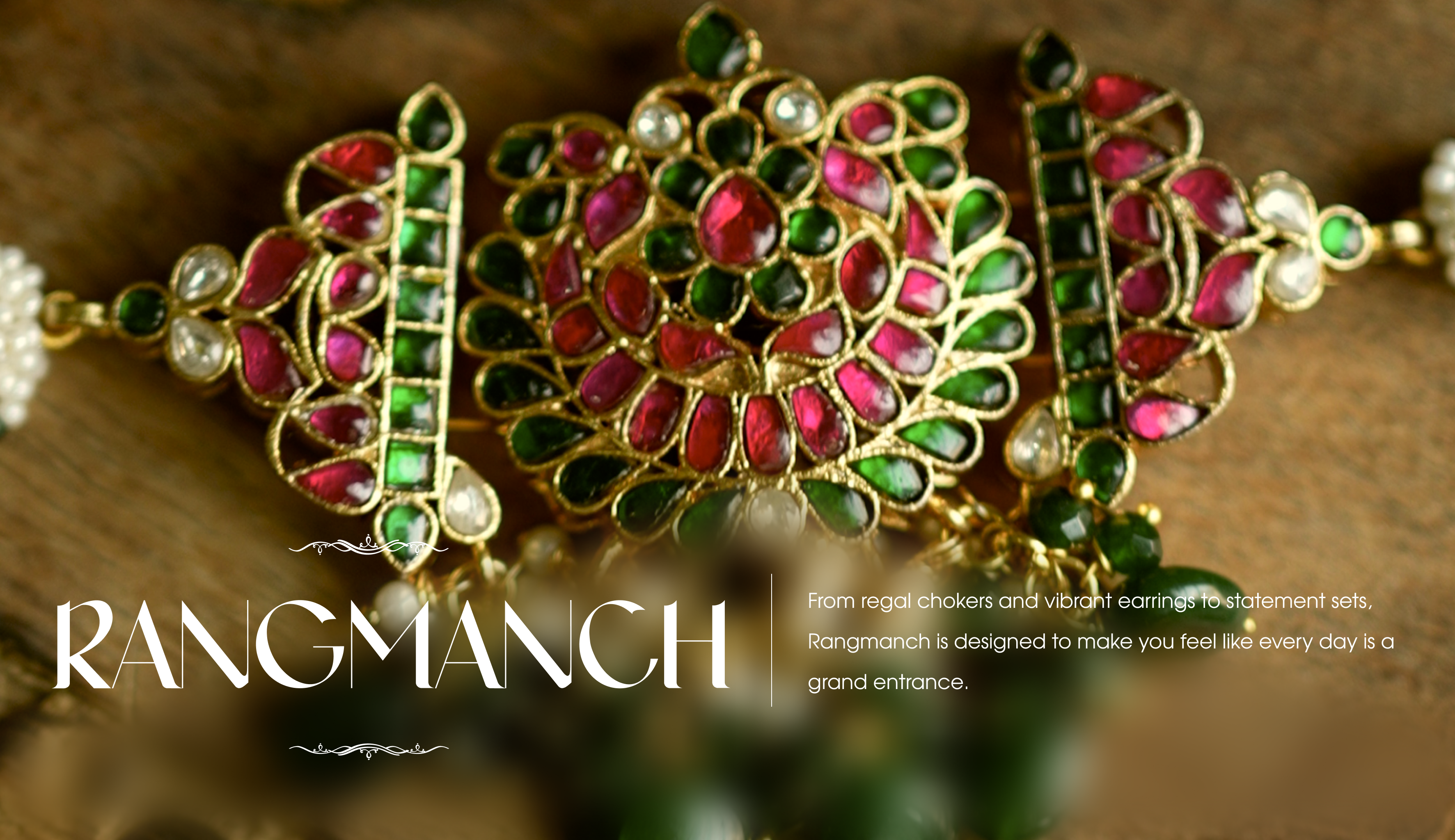 Rangmanch is where colour takes centre stage. Inspired by performance, drama, and heritage aesthetics, this collection brings together bold Takkar stones in deep ruby and emerald tones with classic Kundan detailing. Every piece is designed to feel expressive and confident, whether you’re dressing for a festive celebration or adding impact to a simpler look. Rich finishes and statement silhouettes make Rangmanch jewellery impossible to overlook.